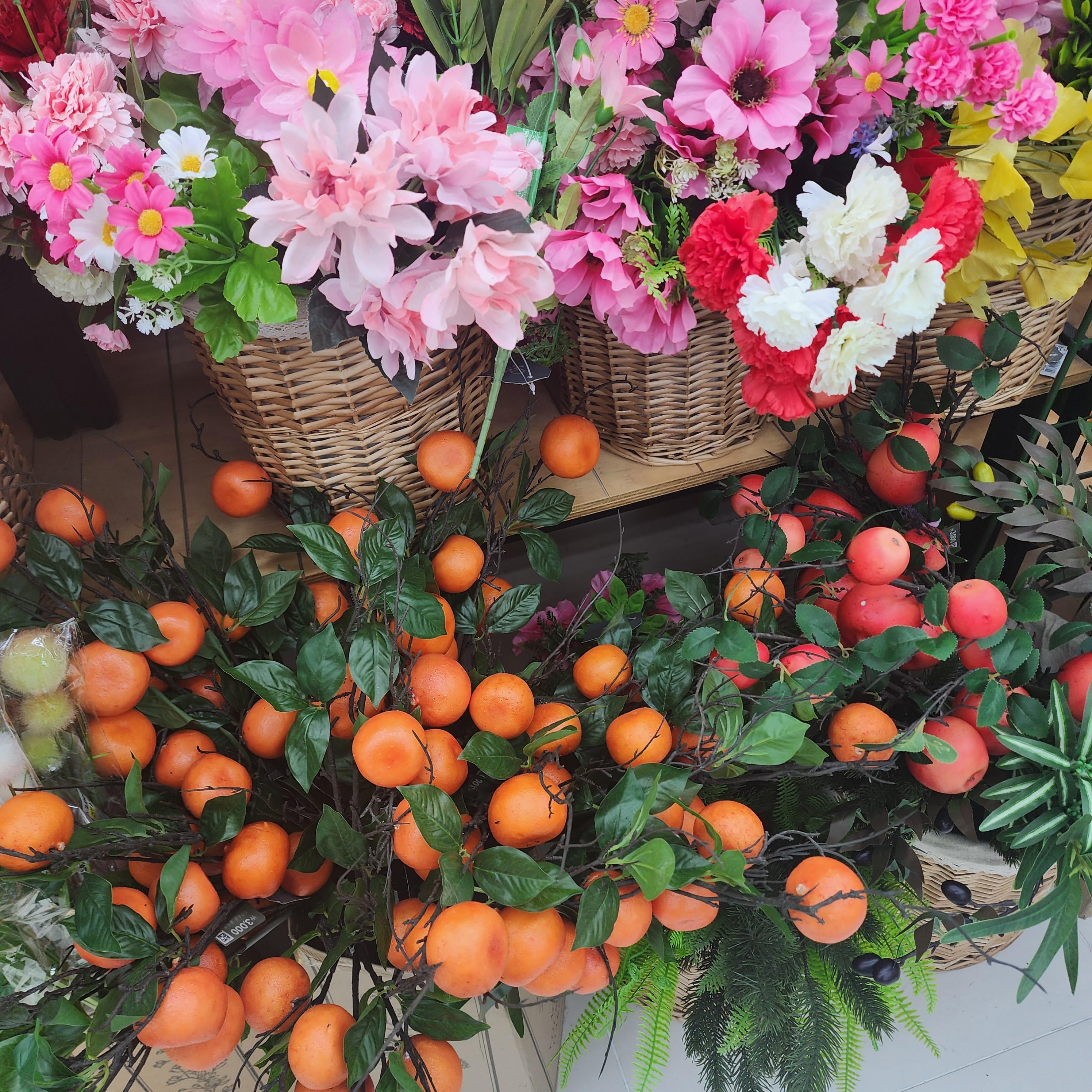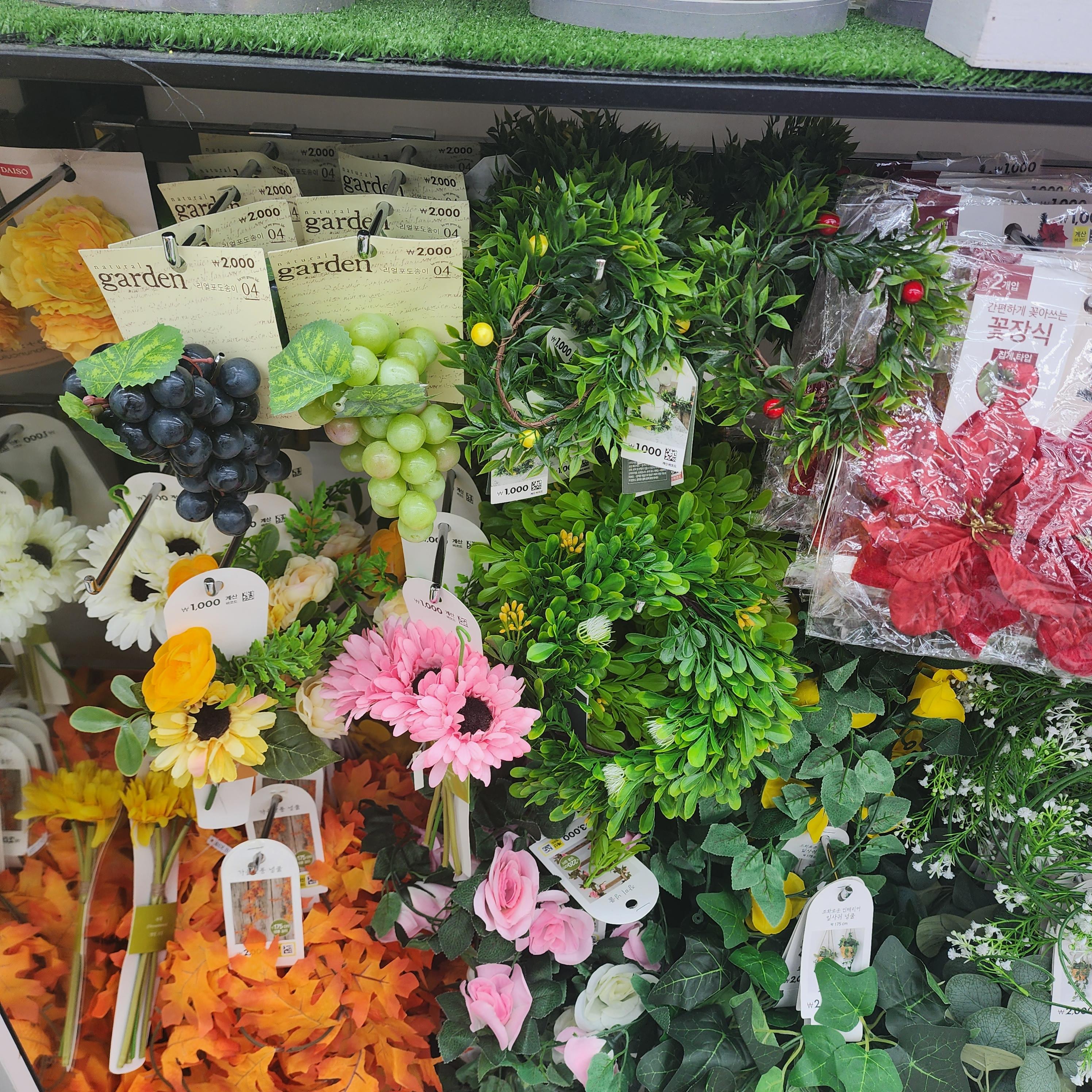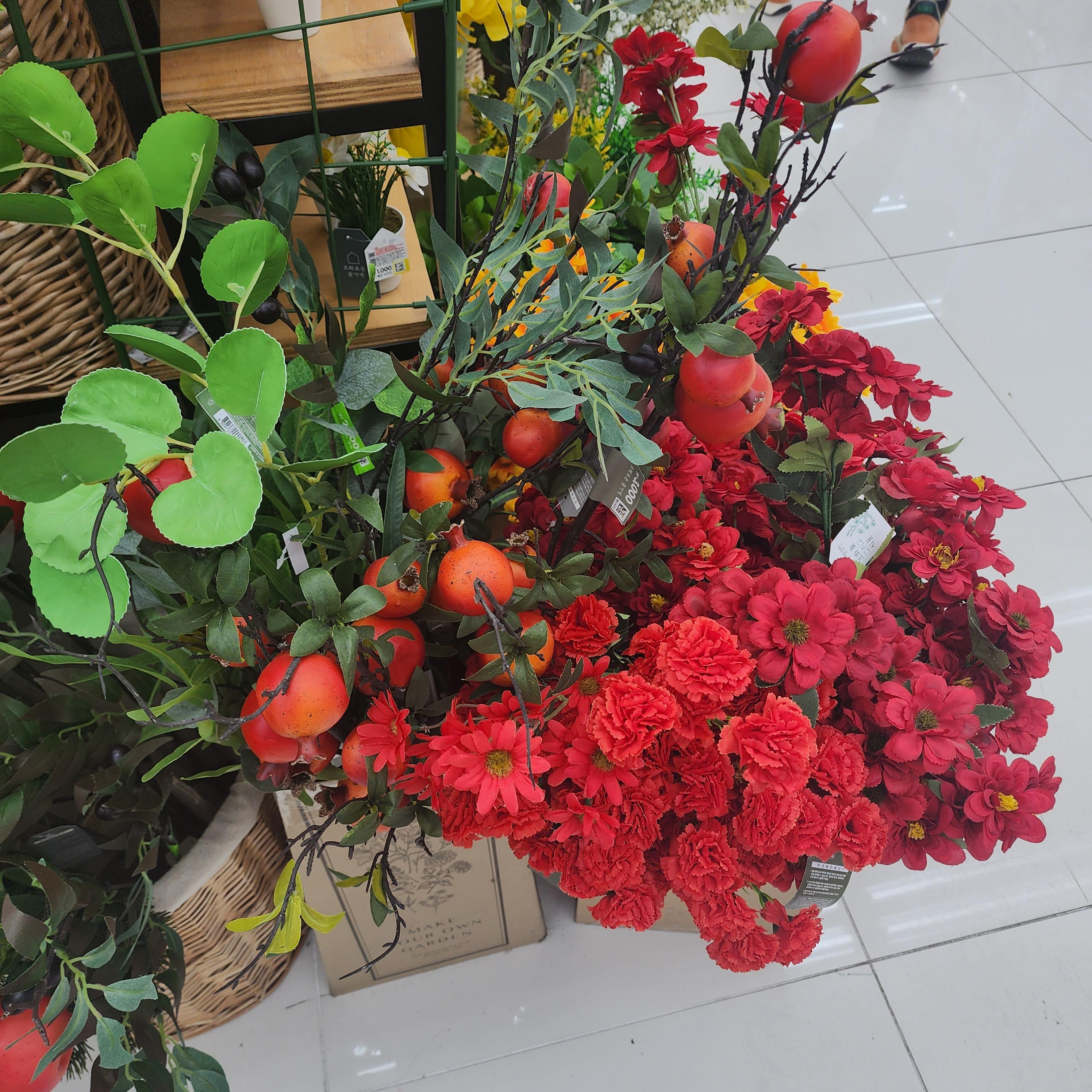 다이소에 있는 조화로 침구류나 의류촬영할때 소품으로 쓰기 좋고 인테리어 소품으로도 좋아보입니다. 다양한 과일과 꽃도 있었습니다. 화분으로 된 조화나 식품 목업도 여러개를 볼 수 있었습니다.