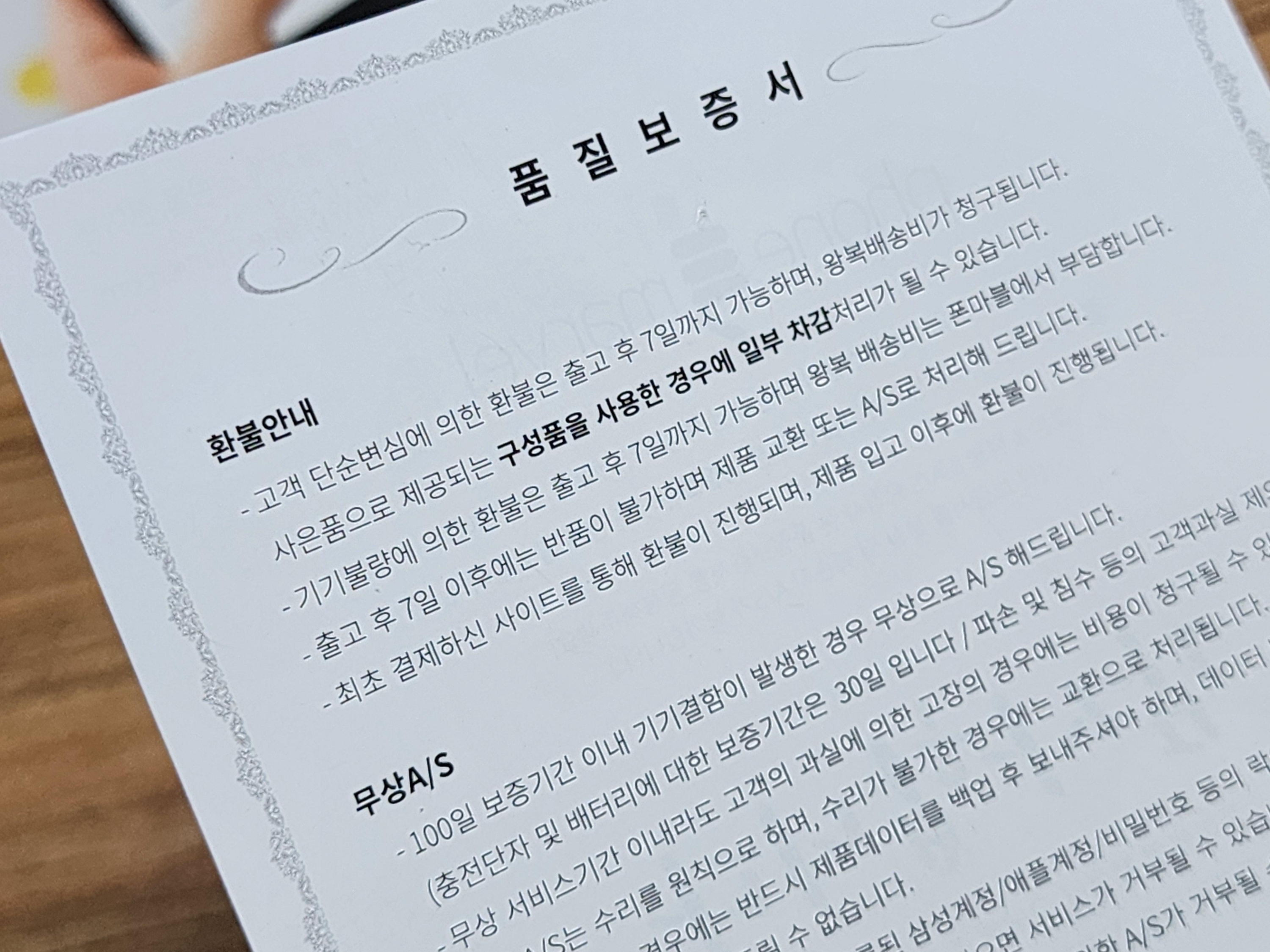 기기불량은 출고 후 7일내로 가능하다고 하고 7일이후에는 AS로만 가능하다고 되어 있습니다. 무상AS는 기기결함시 100일보증기간을 두고 있고 배터리와 충전단자는 30일이라고 되어 있습니다. 문제가 없기를 바라며 지금 잘 사용하고 있습니다.