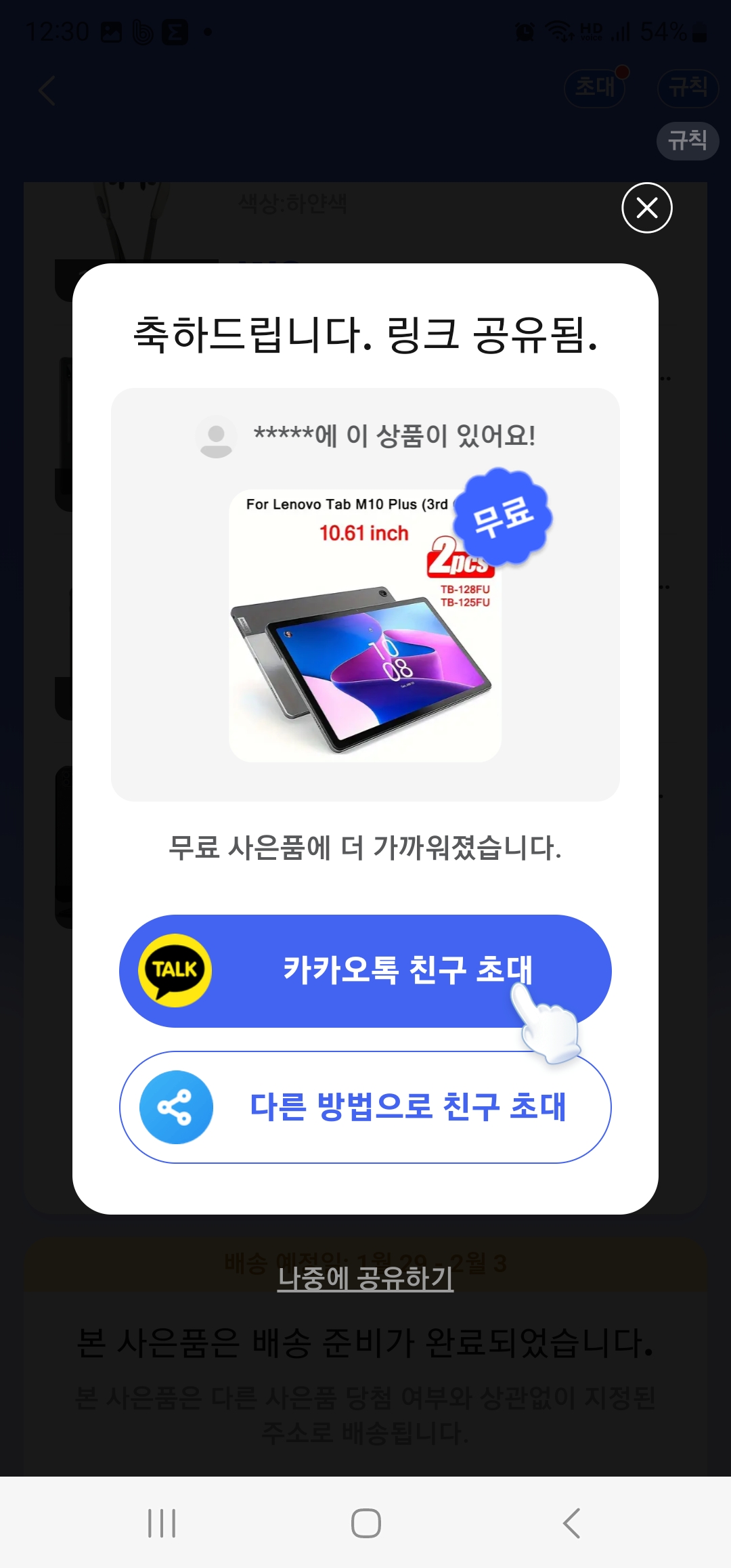 초대 미션을 하고 상품을 선택하여 제품이 실제로 주문이 되는 것을 알 수 있습니다. 상품명은 보이지 않고 아래처럼 이미지만 보이는데 아이패드를 주는 줄 알고 선택을 했습니다. 금액이 보여지는 페이지가 있는데 처음할 때는 눈에 들어오지 않습니다. 그래서 정말 받는것인가?하고 이벤트를 진행을 했는데 이벤트 도중에 3번째 아이템을 먼저 보내주겠다고 하니 더 기대를 하고 열심히 이벤트를 참여했습니다. 아이패드, 갤럭시패드를 하고 나니 선택할 게 없어 싸구려 마사지기나 하나 더 하자고 해서 모두 선택하고 기다렸습니다.