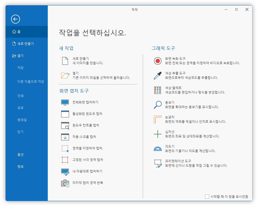 픽픽을 처음 사용 시에는 약간의 불편함을 느낄 수 있습니다. 프로그램을 실행하면 제어판과 같은 디자인으로 캡처화면인지 모르는 페이지가 나타납니다. 처음에는 실행을 하고 사용할 캡처방법을 선택하면 되고 단축키를 외워 편하게 할 수 있습니다.