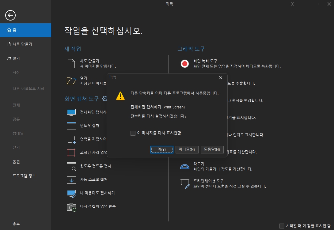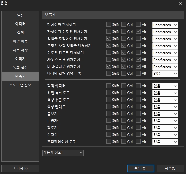 캡처프로그램을 설치하게 되면 프로그램으로 설정을 바꿔야 합니다. 바꾸지 않게 되면 윈도우 캡처 또는 기존 사용하던 프로그램이 실행이 되니 단축키를 다시 설정하고 사용하면 됩니다.