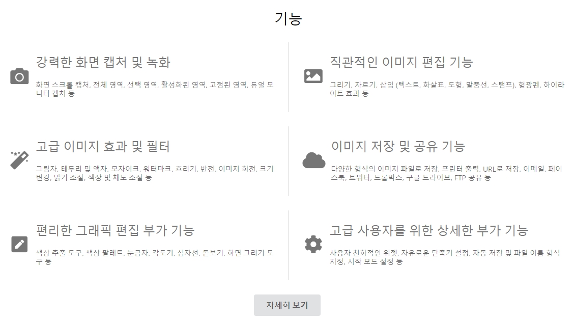 픽픽의 가장 큰 장점은 동영상 녹화는 물론 화면녹화까지 가능하여 간단한 짤을 만들 수 있다는 점과 캡처영역이 자유롭게 드래그 해서 영역을 지정해서 캡처를 할 수 있습니다. 또, 편집툴(그리기, 스탬프, 도형) 기능이 있어 간단한 편집이 가능합니다. 이미지를 편집하고 구글드라이브, 엑셀, 파워포인트등 공유를 할 수 있는 기능도 있습니다. 그래픽도구도 상당히 잘 들어가 있는데 화면녹화, 색상추출, 돋보기, 눈금자, 각도기, 프리젠테이션 기능이 있습니다.