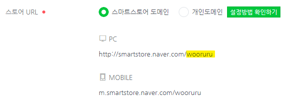 스마트스토어를 선택하고 스토어 ID를 입력합니다. 도메인은 스마트스토어의 URL를 입력합니다. 스토어 URL은 메뉴에서 [스토어관리] - [스토어설정] - [기본정보관리]에 스토어 URL에 있습니다.