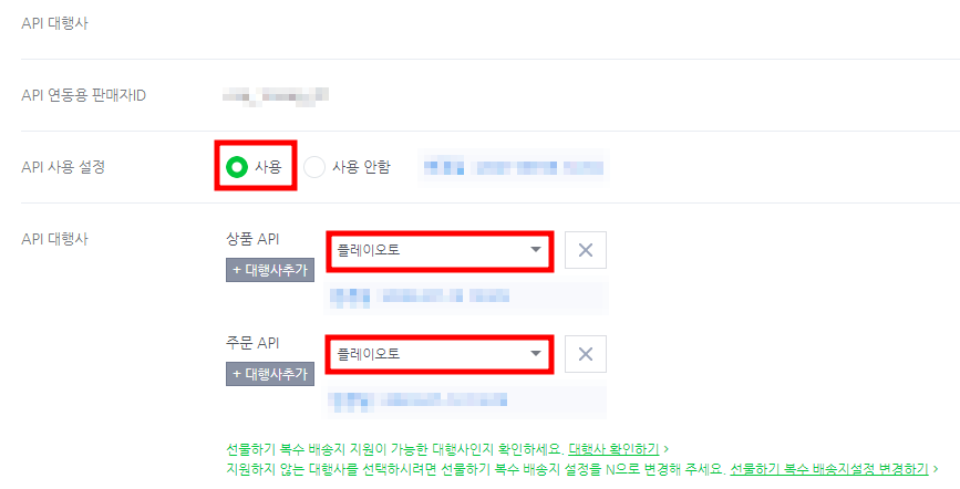 API 연동용 판매자 ID는 [스토어관리] - [스토어설정] - [API관리]에 있습니다. API사용설정에 [사용]을 하고 상품 API와 주문 API에 대행사를 추가해 [플레이오토]로 바꿔줍니다.