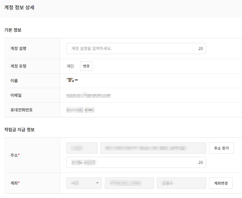 · 계정유형 : 개인 (사업자로 할 경우 계산서 발행)