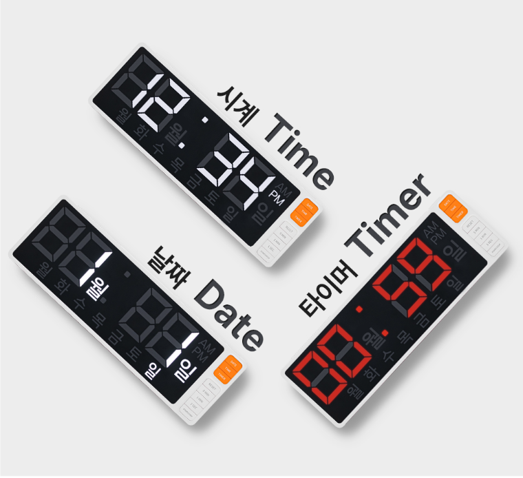 7.5인치 화면으로 차량에 있는 네비게이션 크기정도로 생각하면 됩니다. 매우 큰 사이즈입니다. 아주 선명한 고휘도 LED를 사용하여 밝은 곳에서도 뚜렷하게 잘 보이는 타이머입니다. 남은시간이 1분 미만이 되면 빨간색 숫자로 카운트가 되는 기능이 있습니다. 탁상, 벽부형, 스탠딩으로 사용하여 다양한 장소에서 활용이 가능합니다. 4가지의 알림음으로 선택할 수 있고 음량조절도 4단계 조절할 수 있습니다. 미니타이머와 마찬가지로 자동 절전기능이 있고 사용하지 않을시 자동으로 절전이 됩니다.