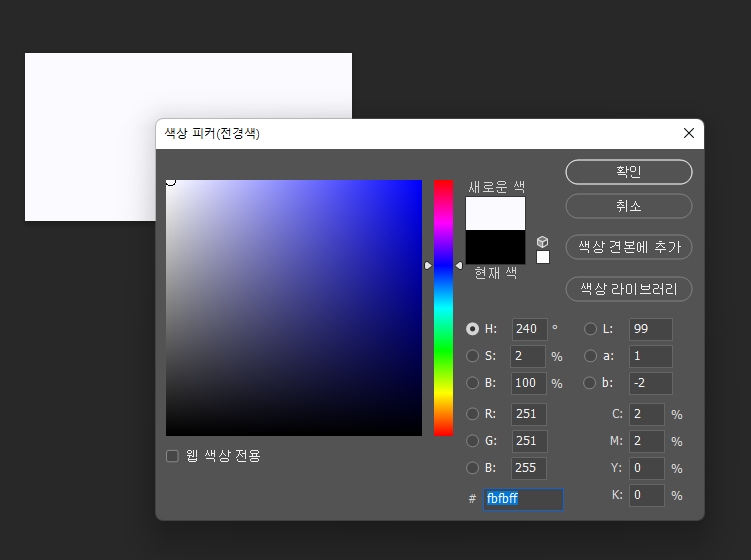 배경컬러 값(#FBFBFF)를 메모를 합니다. 예를 든것이니 작업하신 파일의 배경값을 추출하면 됩니다.