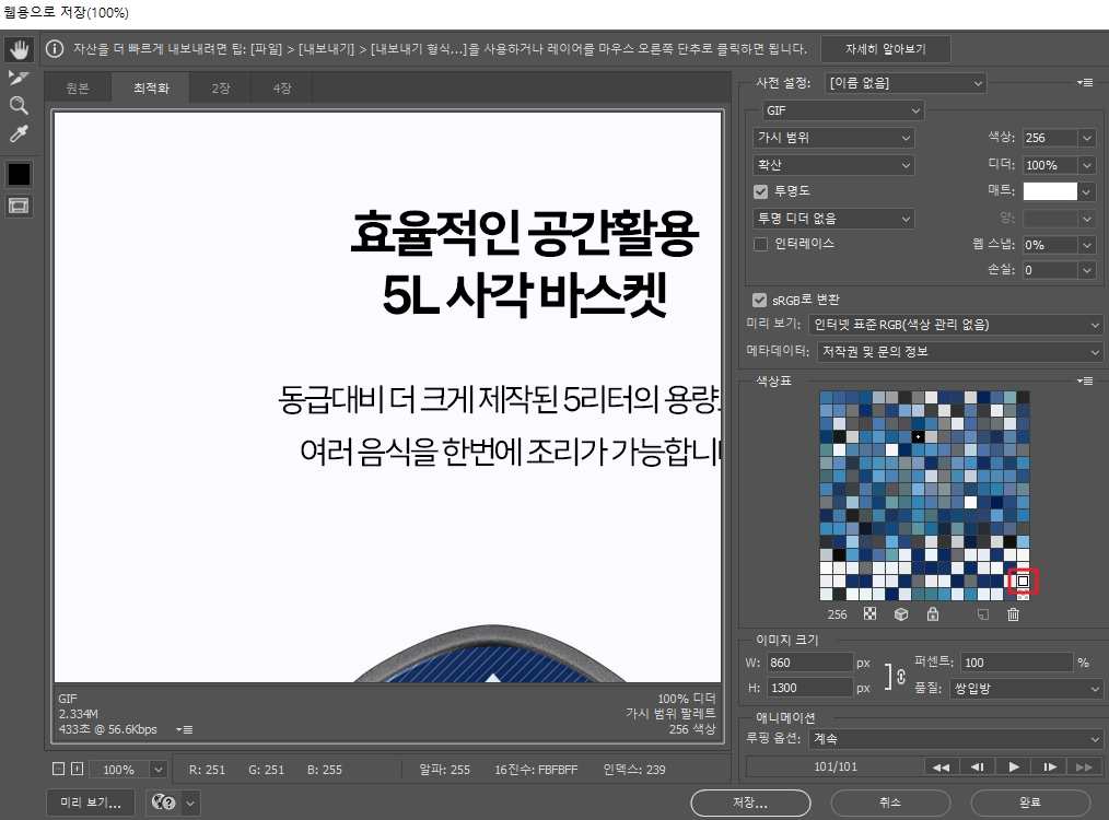 포토샵에서 다시 [웹용으로 저장]으로 넘어가 색상표에 배경컬러값과 동일한 색상을 찾습니다.