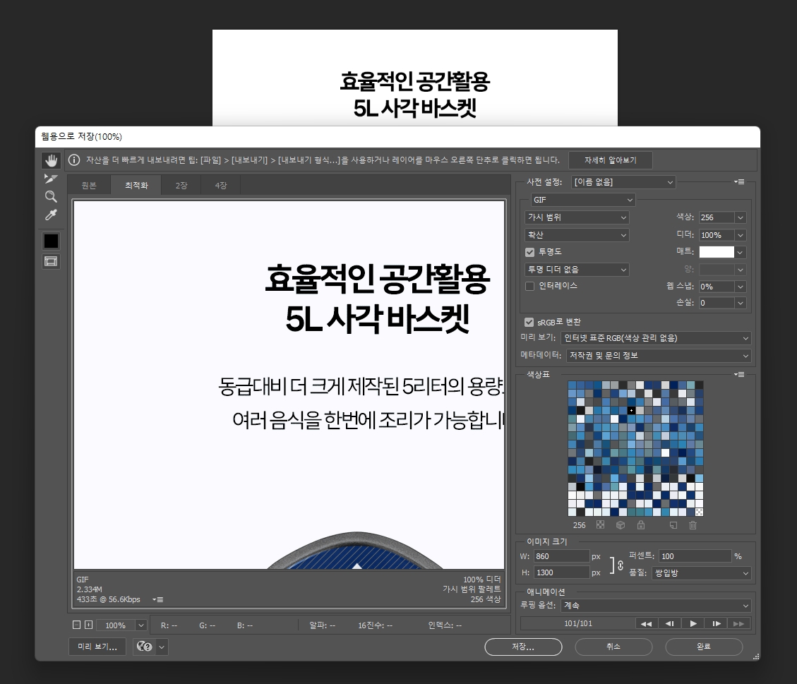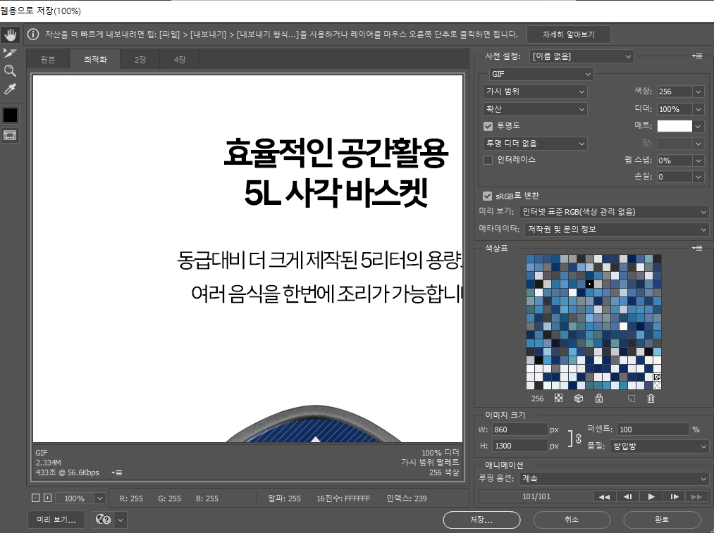 - 이미지를 [웹용으로저장]-[GIF]로 저장한다.