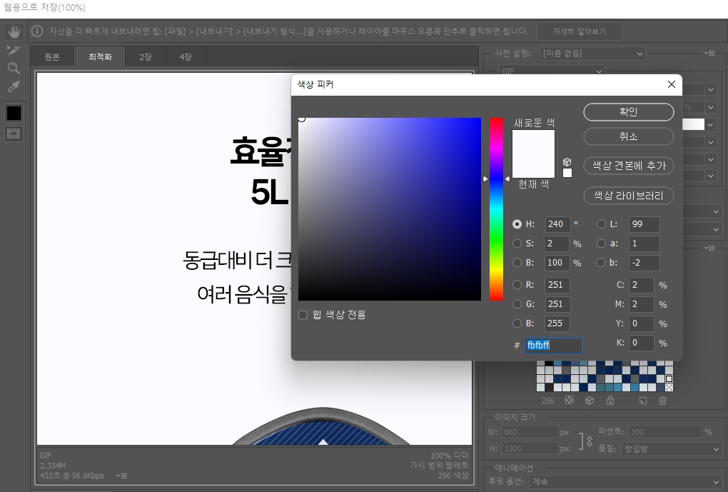 - 다시 [웹용으로저장]에서 메모해둔 컬러값을 찾아 #FFFFFF로 바꾼다.